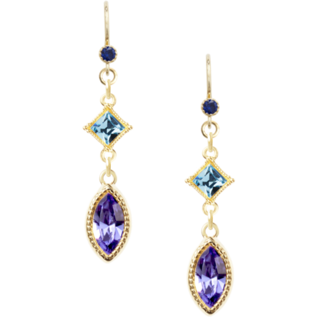 波のさざ波と太陽の光を表現した「海と太陽(ピアス/No12)」。このピアスは、鮮やかなタンザナイトとアクアマリンのブルーがひし形のデザインに映え、真鍮のゴールドパーツと絶妙に調和し、華やかさを引き立てます。個性豊かな変形デザインは、日常のコーディネートにアクセントを加え、特別なシーンでも輝きを放ちます!