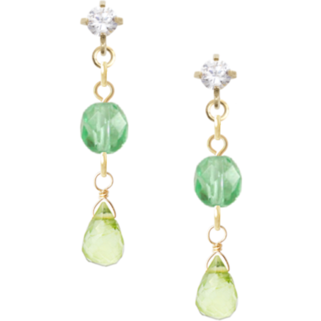 ペリドットの鮮やかなきみどり色が目を引く「海と太陽(ピアス/No24)」。このピアスは、希望をもたらすと言われるペリドットを中心に、天然石とファイヤポリッシュのパーツが絶妙に組み合わさっています。生命力を高め、精神を安定させるエネルギーを感じさせるデザインは、特別な日だけでなく、日常のスタイルにもぴったりなアイテムです!